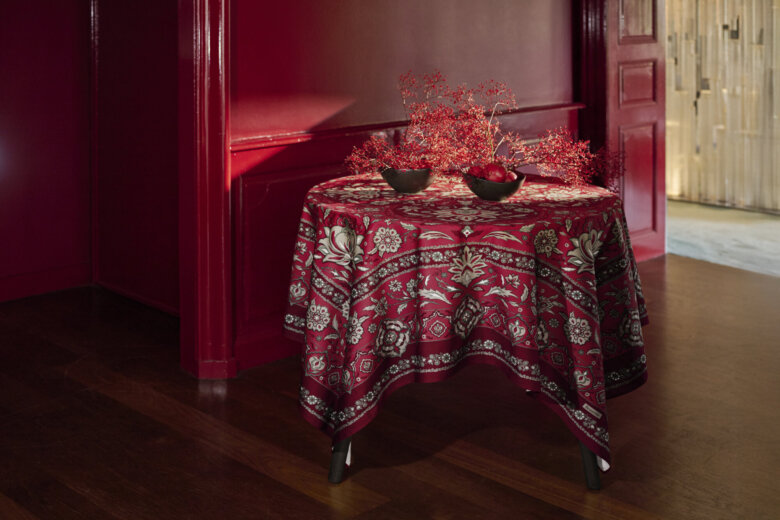 Par exemple : notre nappe Parfum d’Orient grenat (170 x 170 cm) habille élégamment une table ronde en lui donnant tout le charme d’un opéra Italien avec une retombée des plus raffinées.
