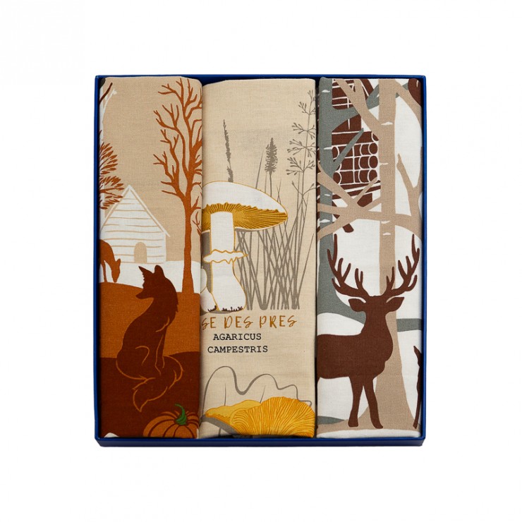 Das Set En forêt lädt Sie zu einem herbstlichen Spaziergang mitten im Wald ein. Drei außergewöhnliche Geschirrtücher : La Lanterne, Les champignons und Escapade en forêt, verbinden raffinierte Muster mit edlen Materialien und bringen Wärme, Eleganz und Poesie in Ihre Küche.