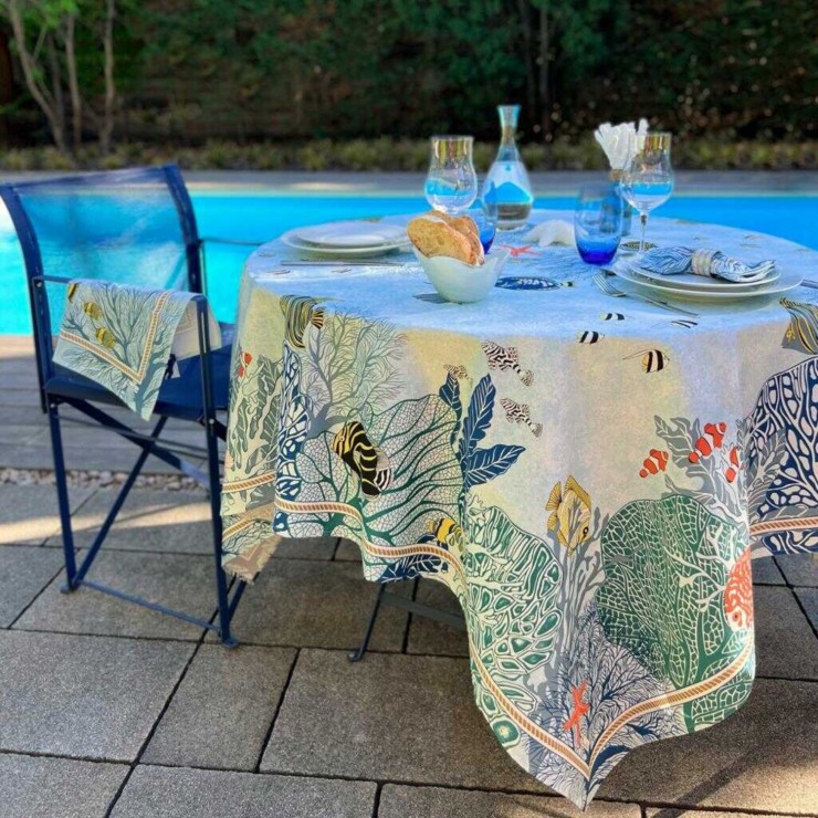 Die Tischdecke Porquerolles, ein maritimes Dekor Tauchen Sie mit der Tischdecke Porquerolles und ihrem reichhaltigen maritimen Dekor in die Tiefen des Meeres ein. Diese schmutzabweisende Tischdecke ist ideal für den Innen- und Außenbereich und zeigt ihre prächtigen Details in Blau- und Korallentönen. Dieses Produkt wird 100% in Frankreich hergestellt