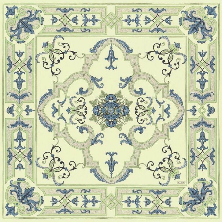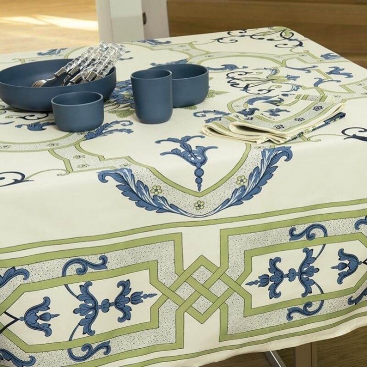 Die Tischdecke Trianon offenbart eine hübsche und sehr architektonische Komposition, die sich durch absinthische Arabesken und indigoblaue Akanthusblätter auf einem nüchternen und dezenten Hintergrund entfaltet. Diese luxuriöse Tischdecke kleidet Ihren Tisch mit Delikatesse.
