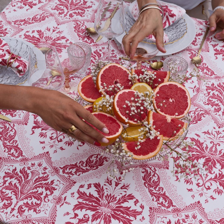 Die Beschichtete Tischdecke Porquerolles, ein maritimes Dekor Tauchen Sie mit der Tischdecke Porquerolles und ihrem reichhaltigen maritimen Dekor in die Tiefen des Meeres ein. Diese beschichtete Tischdecke ist ideal für den Innen- und Außenbereich und zeigt ihre prächtigen Details in Korallentönen. Dieses Produkt wird 100% in Frankreich hergestellt