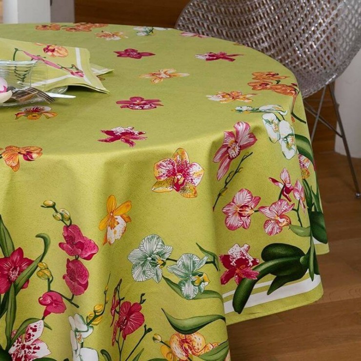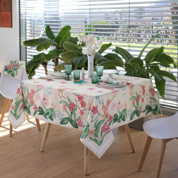 Die Tischdecke Orchidées ist von der grünen Natur inspiriert, die unsere Manufacture d'Impression sur Etoffes in Ribeauvillé umgibt.
