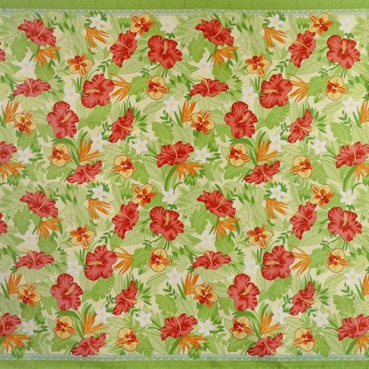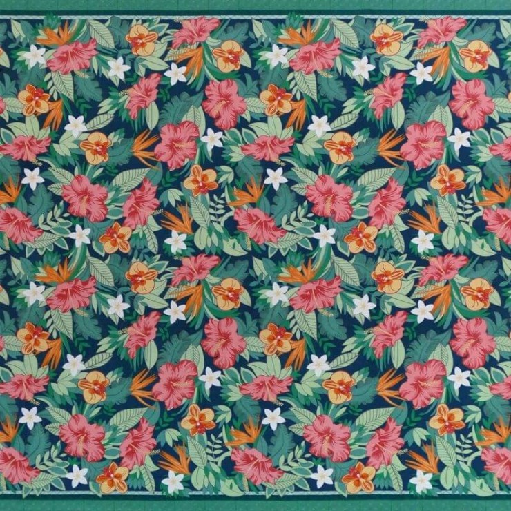 Inspiriert von einem paradiesischen Garten, in dem Hibiskusblüten, Orchideen und Paradiesvögel nebeneinander leben, lädt das Canopée-Tuch zur Flucht in ferne Länder ein.