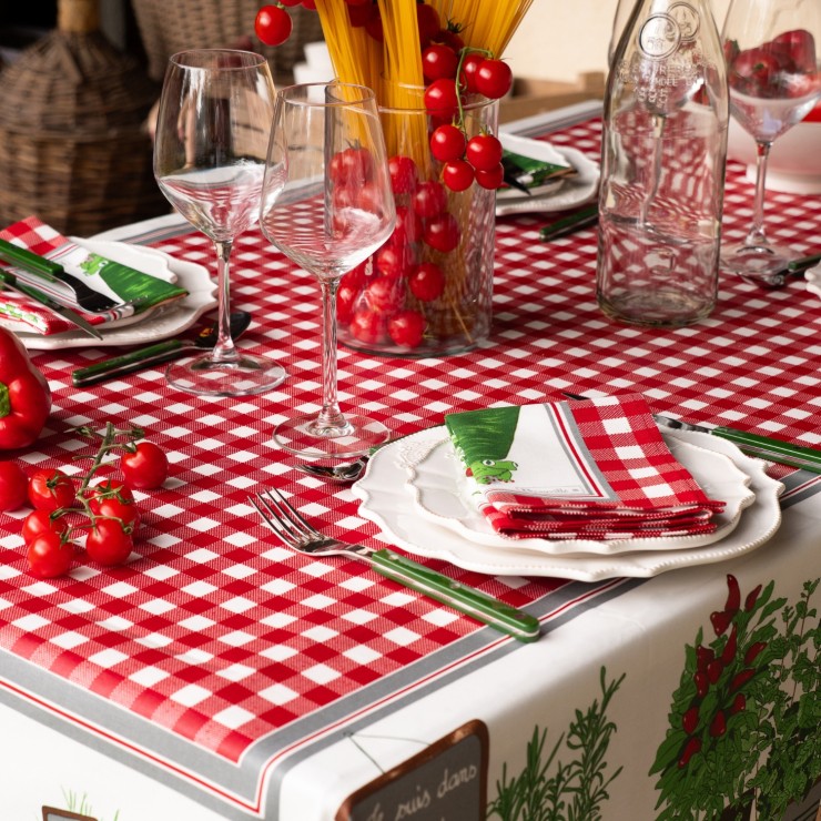 Die Tischdecke Silhouettes Hansi, eine Hommage an die regionalen Traditionen Die Tischdecke Silhouettes Hansi illustriert typische elsässische Szenen des Lebens und spielt mit Schatten und Kontrasten. Diese hübsche Tischdecke auf rotem oder grauem Hintergrund ist eine Hommage an regionale Traditionen. Dieses Produkt wird 100% in Frankreich hergestellt