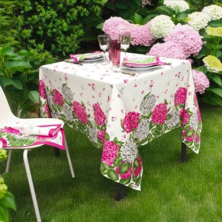 The Hortensias tablecloth, ideal for the beautiful season A flight of delicate hydrangeas invites itself to the table with this pretty tablecloth antistain. Ideal for the beautiful season, the Hortensias tablecloth reveals a sublime bouquet of flowers in shades of pink and white.  This product is 100% Made in France