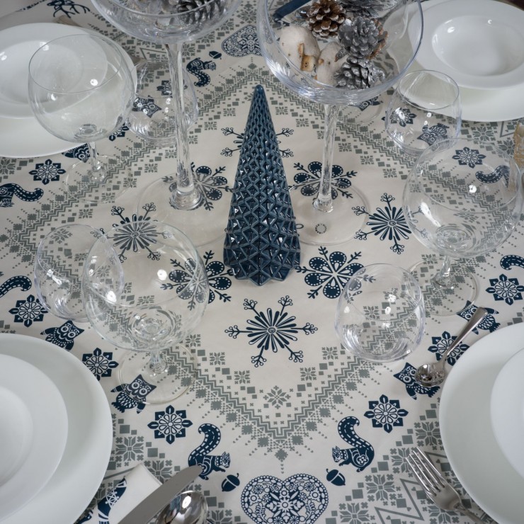 The charm of Balade en hiver tablecloth, crafted for those enchanted by French artisanal tradition and the allure of a winter forest. Adorned with delicate motifs reminiscent of woodland flora and fauna, this exquisite piece brings the magic of a winter stroll into your home.