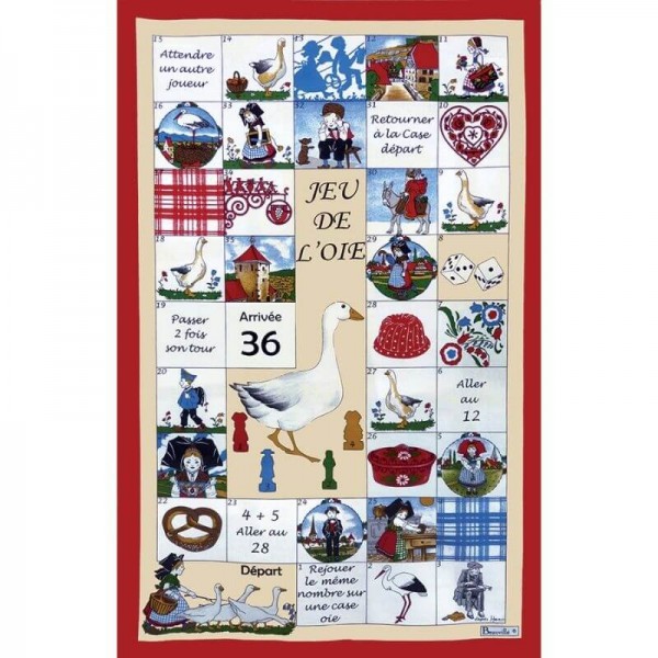 Inspired by the traditional Jeu de l'Oie, this tea towel brings back the memories of a return from school which sounds the hour of a well deserved break. The many traditional motifs on the Jeu de l'Oie tea towel reflect the art of living in Alsace, between conviviality and greed.