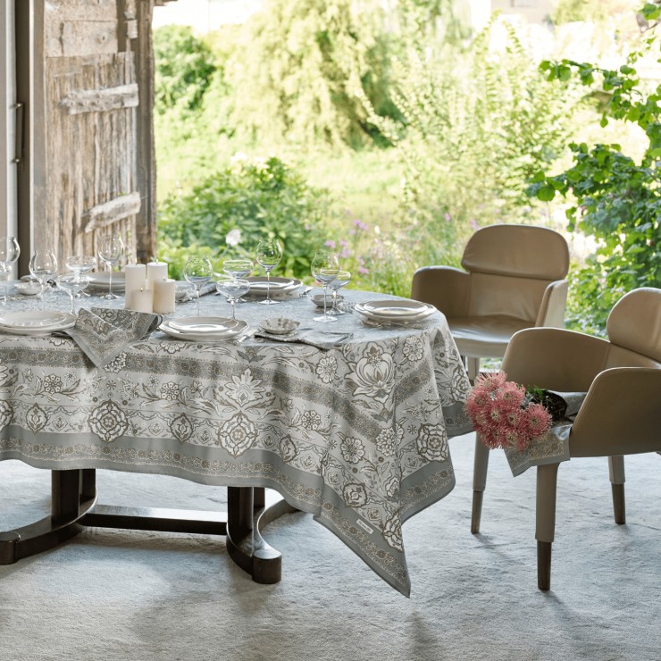 The Parfum d'Orient tablecloth draws its inspiration from the richness and mystery of the Orient. Its elegant motif, with delicate touches of flowers and enchanting colours, turns each meal into a sensorial celebration. Bring the luxury of a sensory voyage to the table.