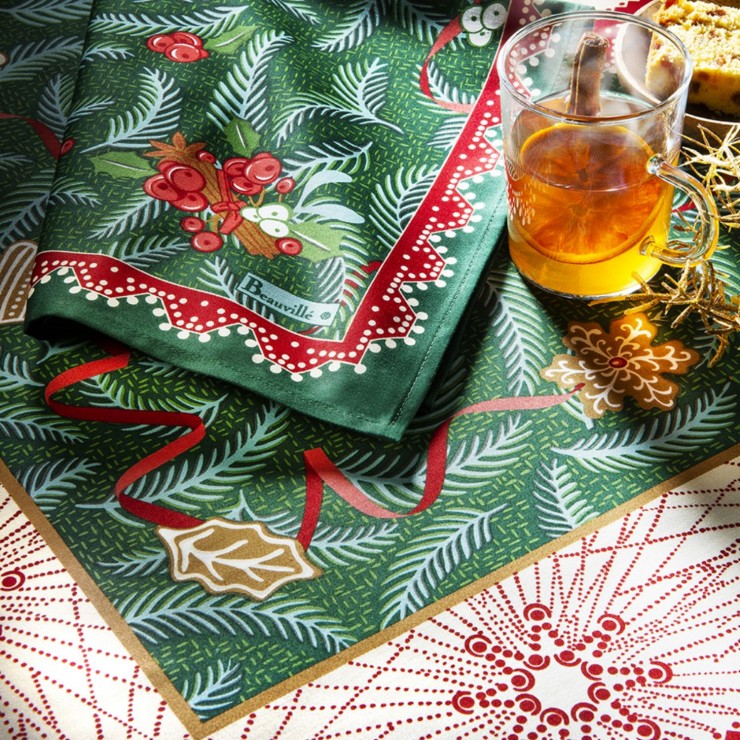 Idéale en temps de fêtes, la serviette Sapin d’Épices dévoile un décor festif et une ambiance chaleureuse. Rubans, baies et branches de sapin s’entremêlent avec élégance sur cette jolie serviette de table.