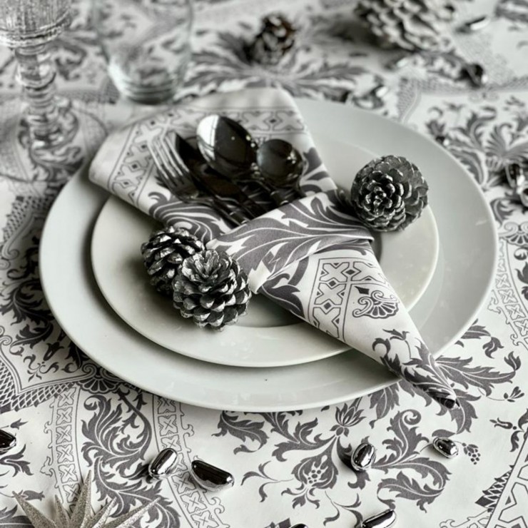 La serviette Trianon, une magnifique composition artisanale La serviette Trianon s’inspire du domaine du château de Versailles et vous propose une magnifique composition ornementale : feuilles d’acanthe et arabesques se dessinent sur cette magnifique serviette de table. Ce produit est fabriqué à 100% en France