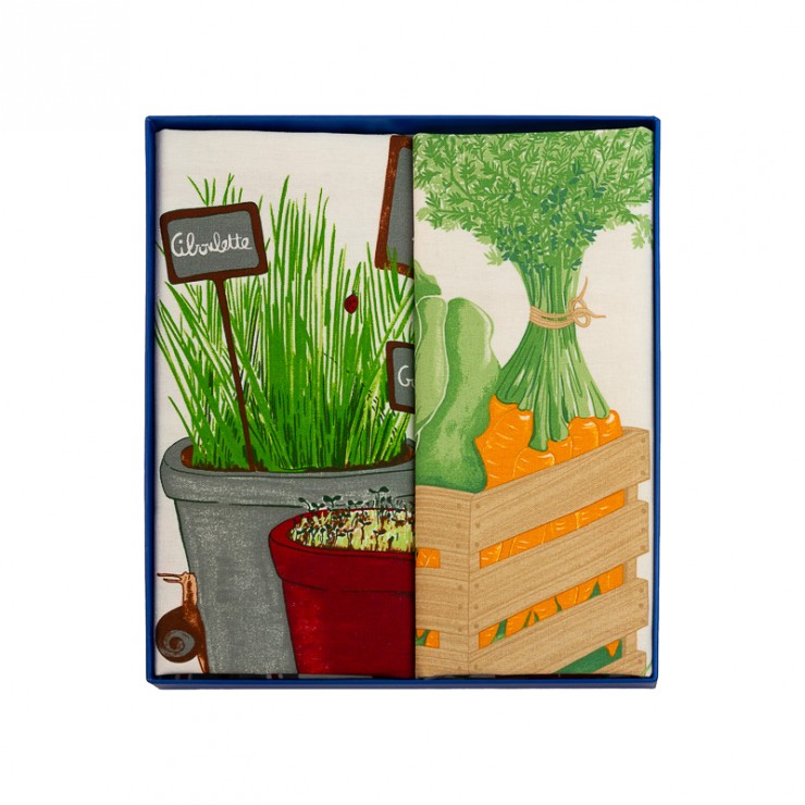 Godetevi una passeggiata al mercato con gli strofinacci Petit Marché e Aromatic. Il cofanetto regalo Ritorno dal mercato porta freschezza e allegria in cucina