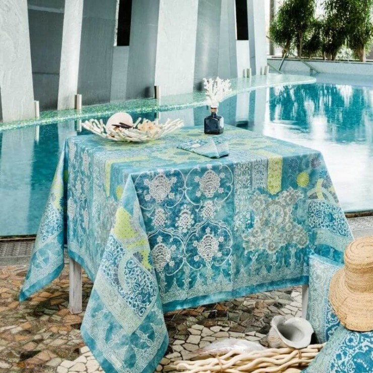 Corail, la tovaglia che ti fa viaggiare Regalati un viaggio esotico con la tovaglia Corallo. Coralli e conchiglie decorano con discrezione questo modello antimacchia dai toni blu e corallo. Un invito a scoprire le meraviglie del fondo marino. Questo prodotto è fabbricato al 100% in Francia, Garanzia Origine Francia 100%.