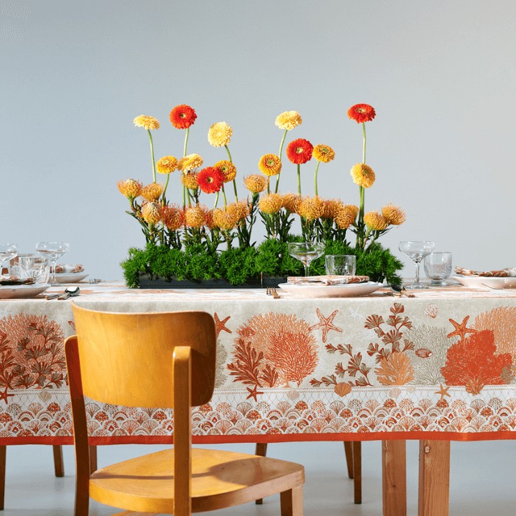 Un motivo marino raffinato, stampato a mano su raso di cotone biologico, che evoca la luce e il movimento dell’acqua. Coralli e forme fluide donano alla tavola un’eleganza luminosa, tra tradizione artigianale francese e spirito mediterraneo contemporaneo.